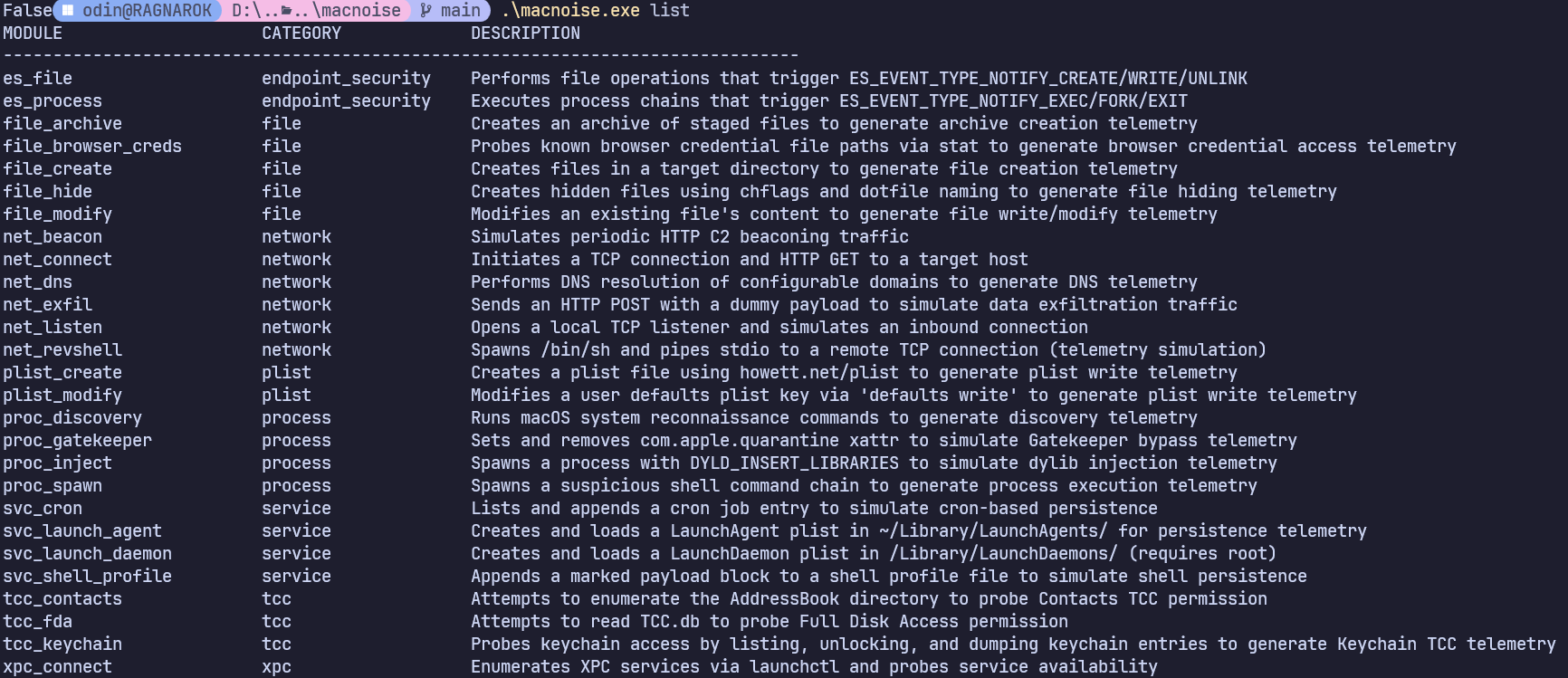 The project is structured to be easily extensible, and is structured in a way that allows for practitioners to customize it for their needs. While this project has a good amount of coverage for various telemetry types, it is not feature complete and I will rely on the community (and my own free time) to continue expanding supported telemetry. To view currently available modules, just run macnoise list: